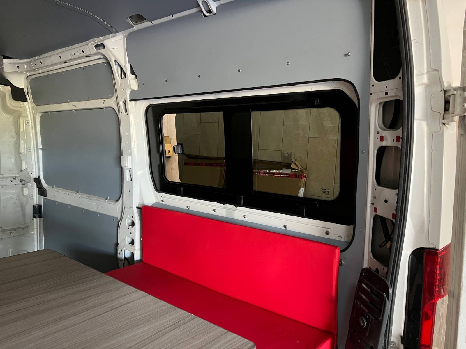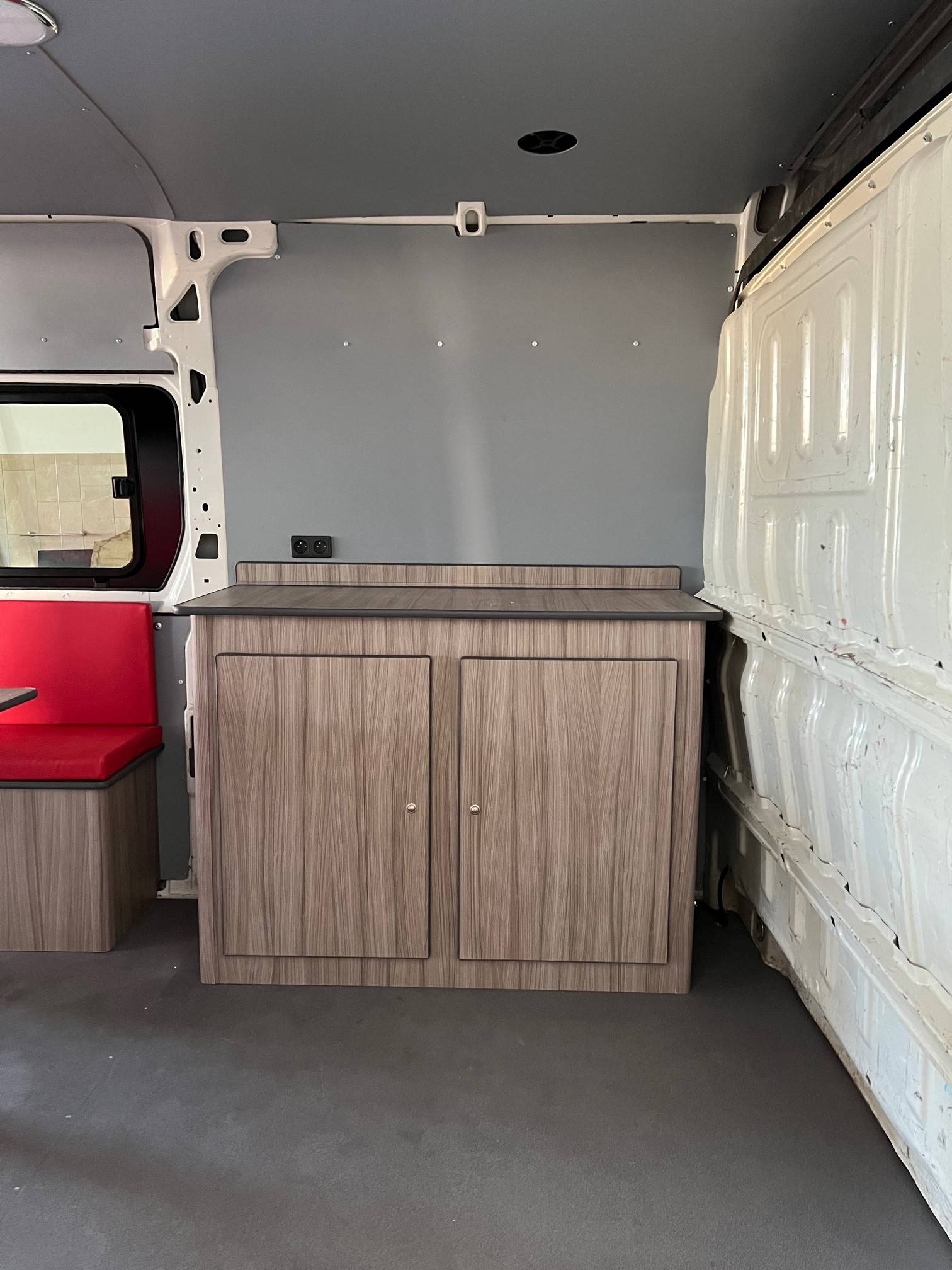 Notre service de personnalisation inclut l'installation d'une banquette fixe avec coussin, une table amovible, une armoire basse de rangement, des vitres teintées, et un store extérieur pour créer un espace de travail pratique et confortable.