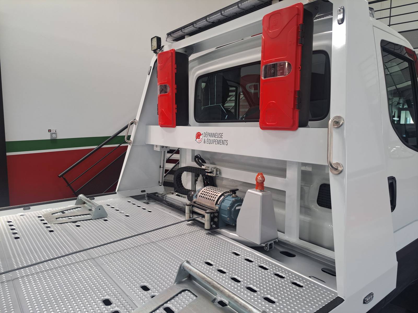 Accessoires pratiques : Le plateau est livré avec deux poulies de renvoi de câble électrozinguées (permettant 9 emplacements de mouflage), un jeu de deux cales de roues extra-plates, ainsi qu'un kit complet (pelle, balai, bac à sable, jerrycan, trois cônes, deux extincteurs et quatre sangles avec tendeurs).