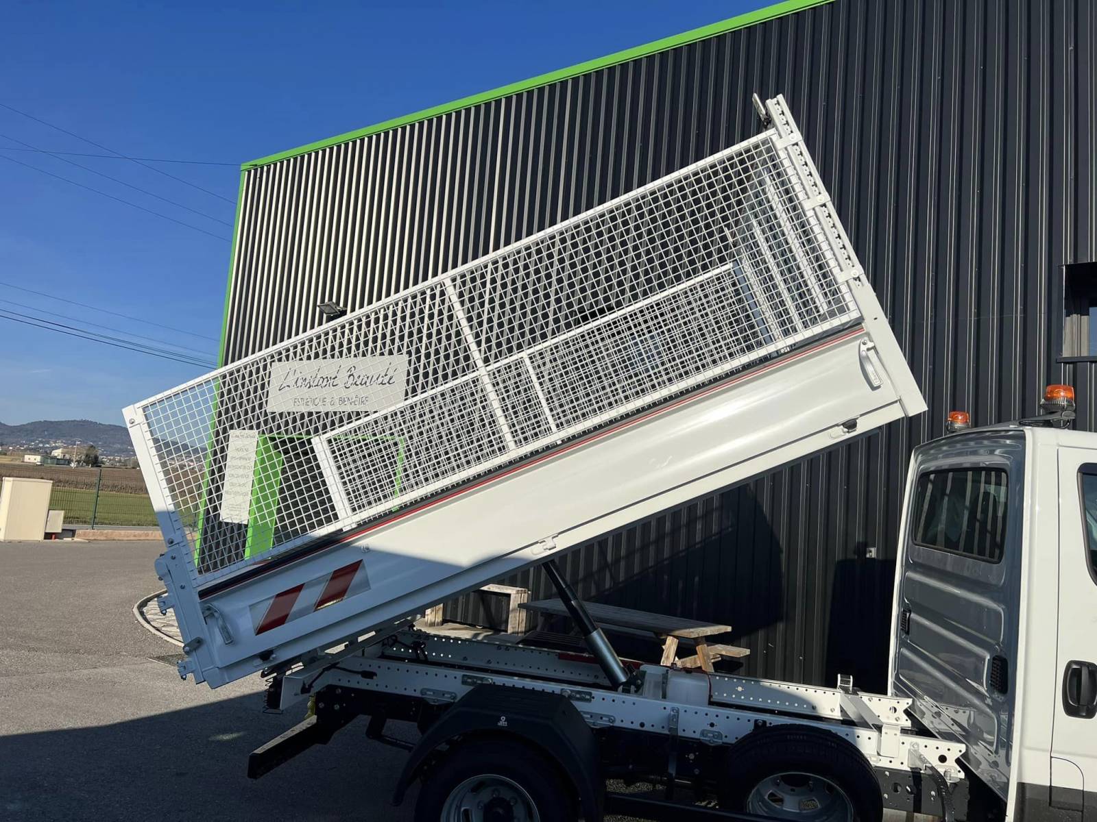 Les fourgons bennes sont souvent utilisés par les paysagistes et les collectivités mais ne disposent pas toujours de rehausses. On distingue les rehausses pleines et les rehausses grillagées. Les rehausses grillagées, présentent sur ce Iveco, augmentent le volume utile de chargement du véhicule utilitaire sans trop ajouter de poids à vide ce qui sécurise donc le transport de "déchets" encombrants.