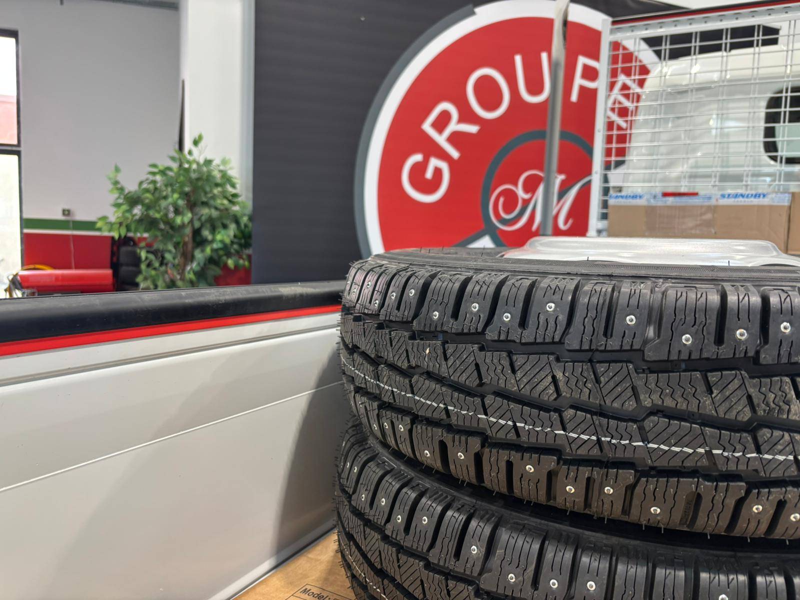 Montage de pneus cloutés, spécialement choisis pour offrir une adhérence maximale sur routes enneigées ou verglacées, garantissant la stabilité et la sécurité du conducteur en toutes conditions.