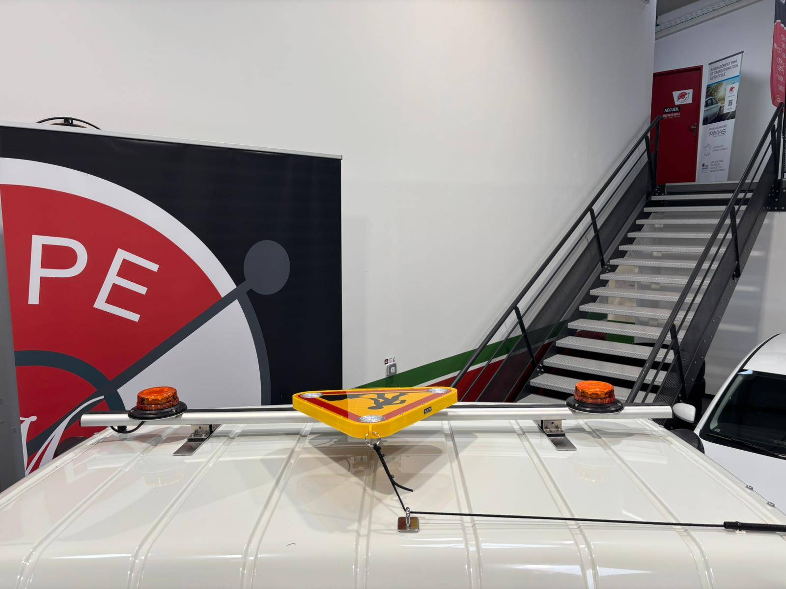 Pose d’une barre à deux gyros LED, accompagnée d’un triangle lumineux de type AK5 à relevage manuel. Ce dispositif assure une signalisation claire et visible, indispensable lors des interventions sur la voie publique, de jour comme de nuit.