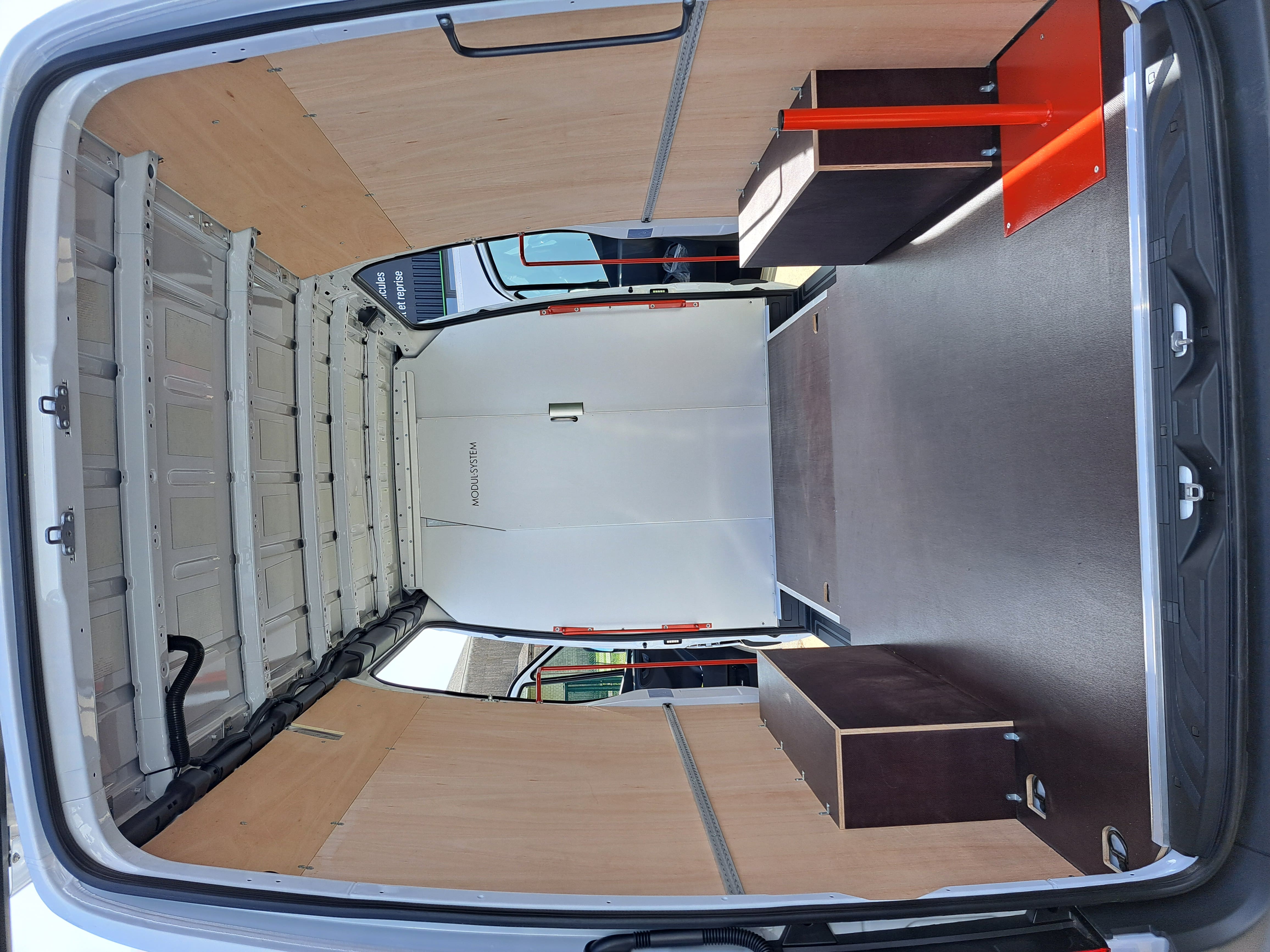 La pose d’un habillage intérieur en bois, protégeant durablement les parois du véhicule tout en offrant un rendu propre, soigné et facile à entretenir.