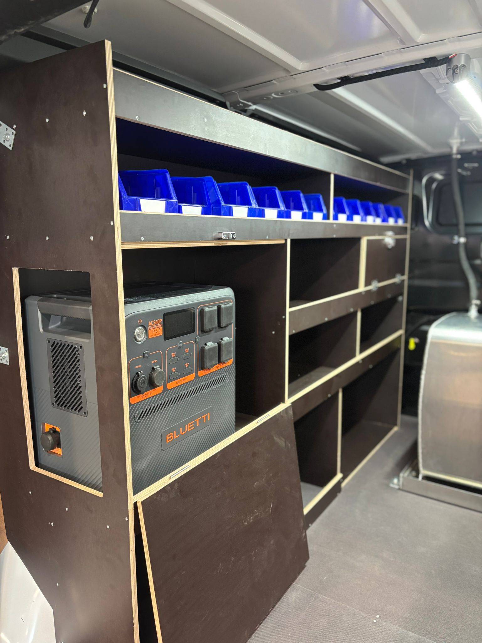 • Pose d’un meuble gauche avec power station et mini établi permettant d’alimenter différents outils électriques directement à bord. Un mini établi complète l’ensemble, offrant un espace de travail pratique pour les opérations de maintenance ou d’intervention sur site.